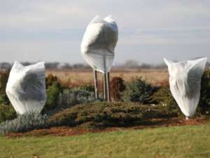 2 – Nałóż kaptur ochronny na delikatne rośliny wymagające okrycia zimą. Załóż go na szczyt rośliny i rozciągnij aż do podstawy.