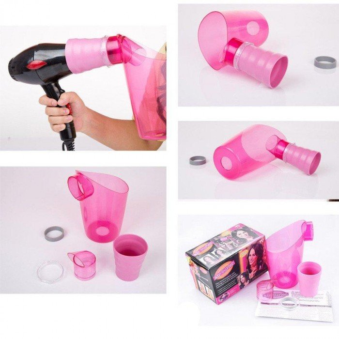 Wystarczy dołączyć urządzenie do Twojej suszarki do włosów (pasuje do większości suszarek), włożyć wilgotne pasmo włosów do pojemnika i rozpocząć suszenie. Dzięki powietrzu suszarki, włosy suszą się i okręcają wokół własnej osi, dzięki czemu powstają loki. Przeznaczone dla włosów do ramion i dłuższych.