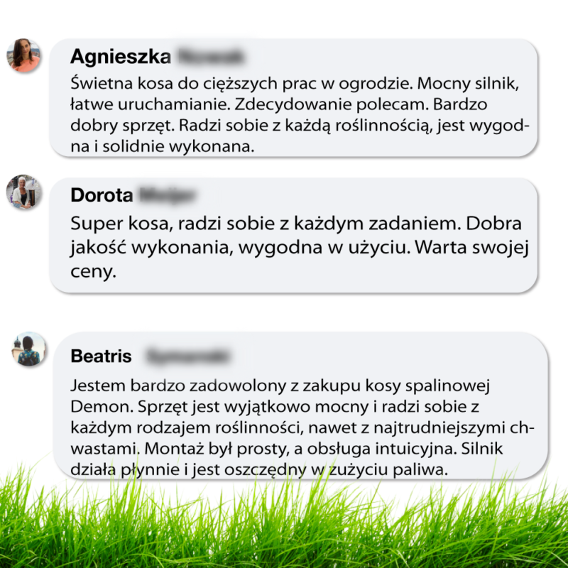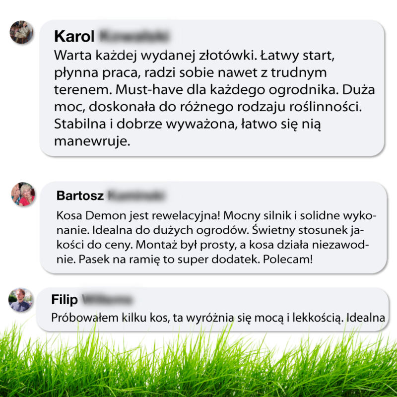 Kosy mechaniczne nowej generacji DEMON radzą sobie doskonale wszędzie tam, gdzie kosiarki jezdne osiągają granice swoich możliwości, np. na zboczach, w terenie gęsto porośniętym drzewami, w terenach trudnych do wykoszenia. Najmocniejszy na rynku silnik DEMON osadzony jest bezpośrednio na uchwycie. Duże ostrze doskonale poradzi sobie nawet z najmocniejszą trawą, zaroślami czy krzewami, poszyciem lub gałązkami.