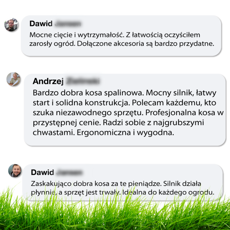 Taki zestaw akcesoriów pozwala na pracę niemal w każdych warunkach. Głowica żyłkowa oraz trymer sprawdzi się w niskiej i średniej trawie, natomiast trójząb świetnie sprawdzą się w gęsto porośniętej trawie czy zaroślach