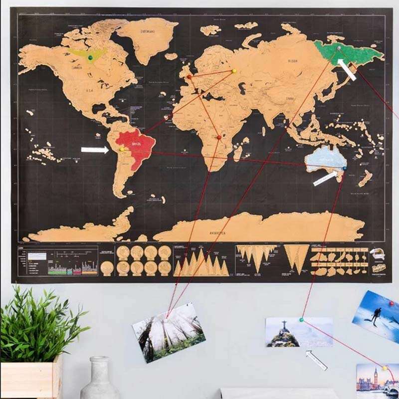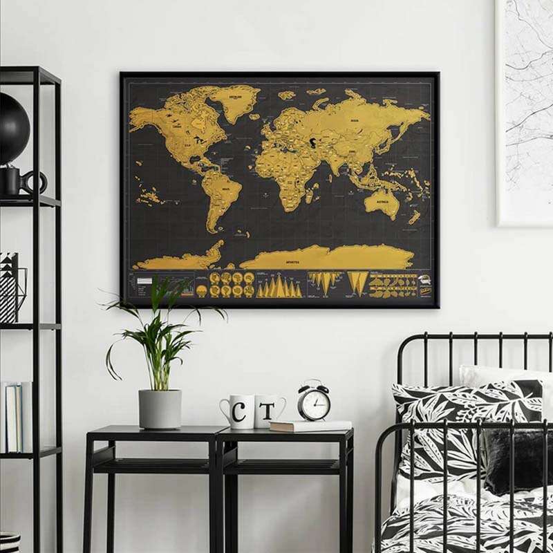 Mapa świata w formie zdrapki to idealna ozdoba pokoju dla miłośników podróży.