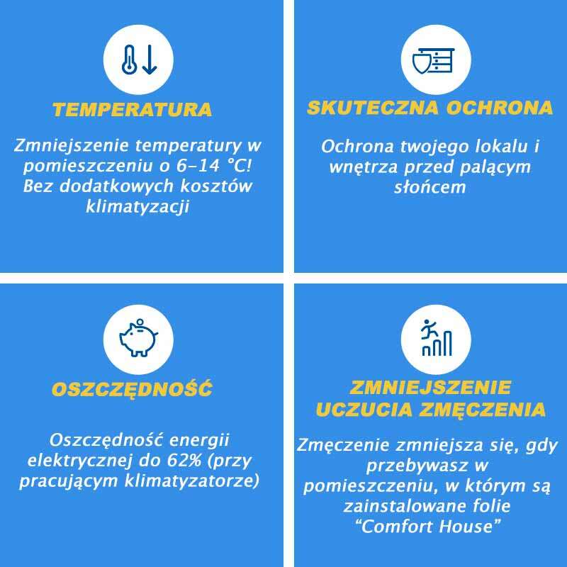 Lustrzana folia przeciwsłoneczna „Comfort House” to zmniejszenie temperatury w pomieszczeniu o 6-14°C bez wydatków na klimatyzację!