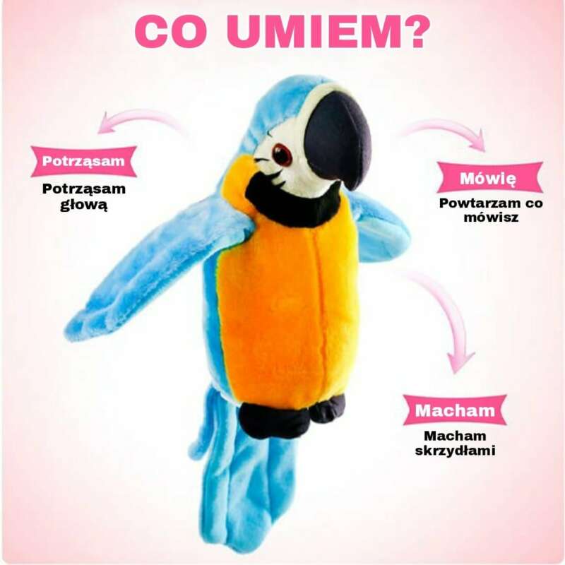 Dzieci uwielbiają tę mówiącą papugę, która powtarza każdą zasłyszaną wypowiedź, a nawet piosenkę. Co więcej, macha skrzydłami i potrząsa głową, co gwarantuje dodatkową zabawę!